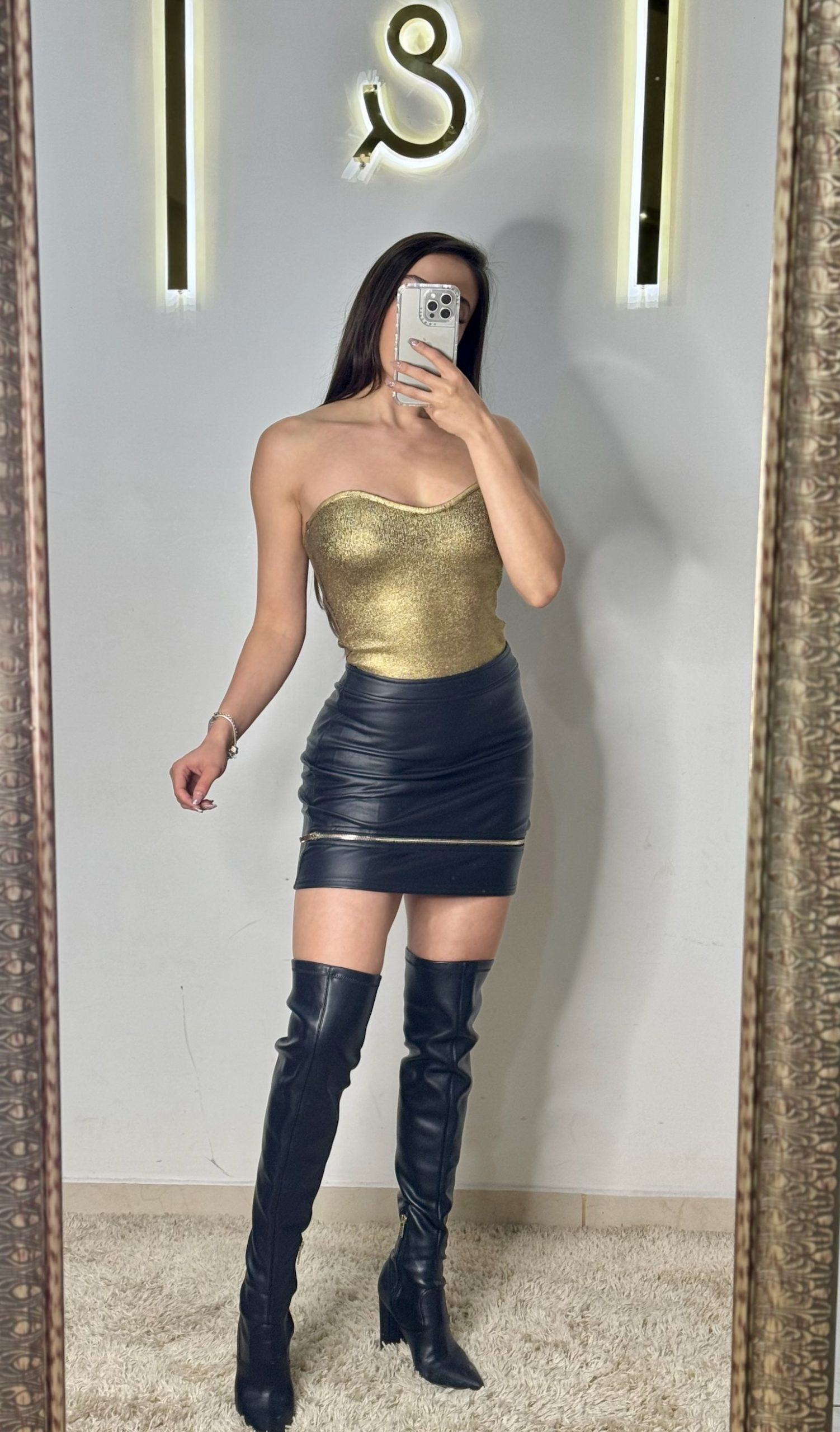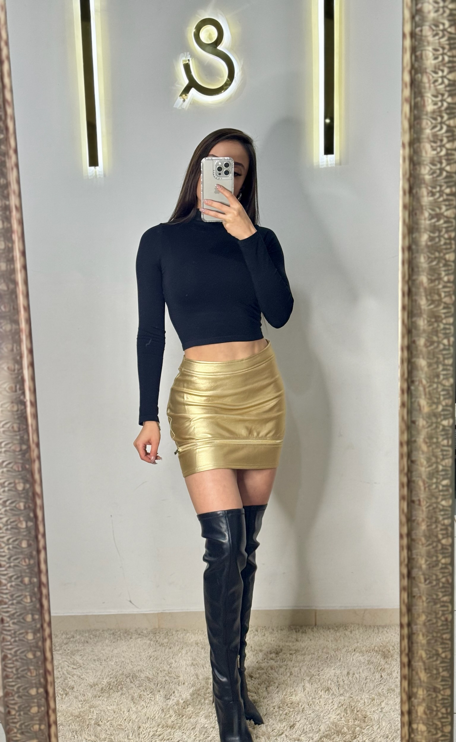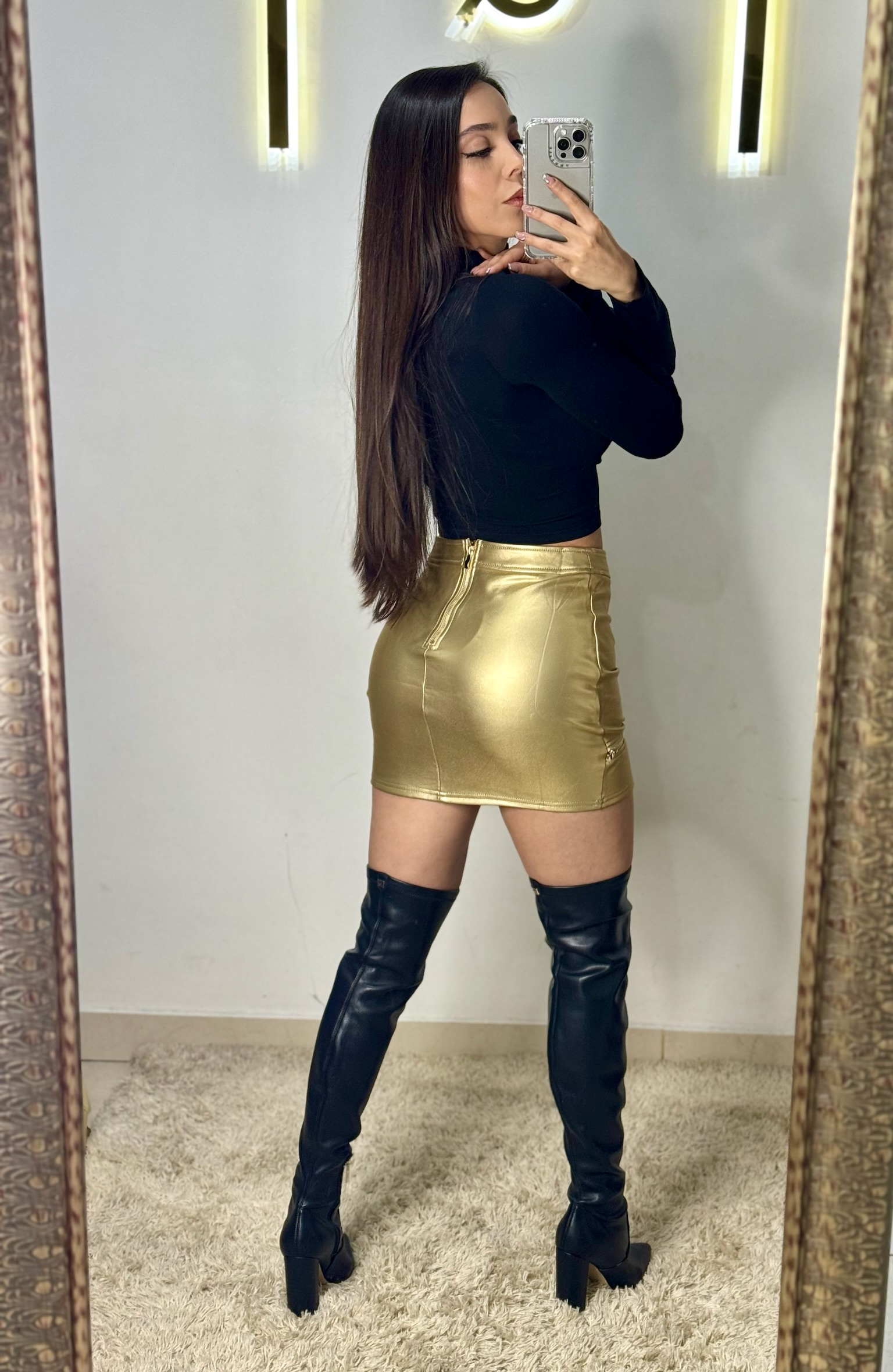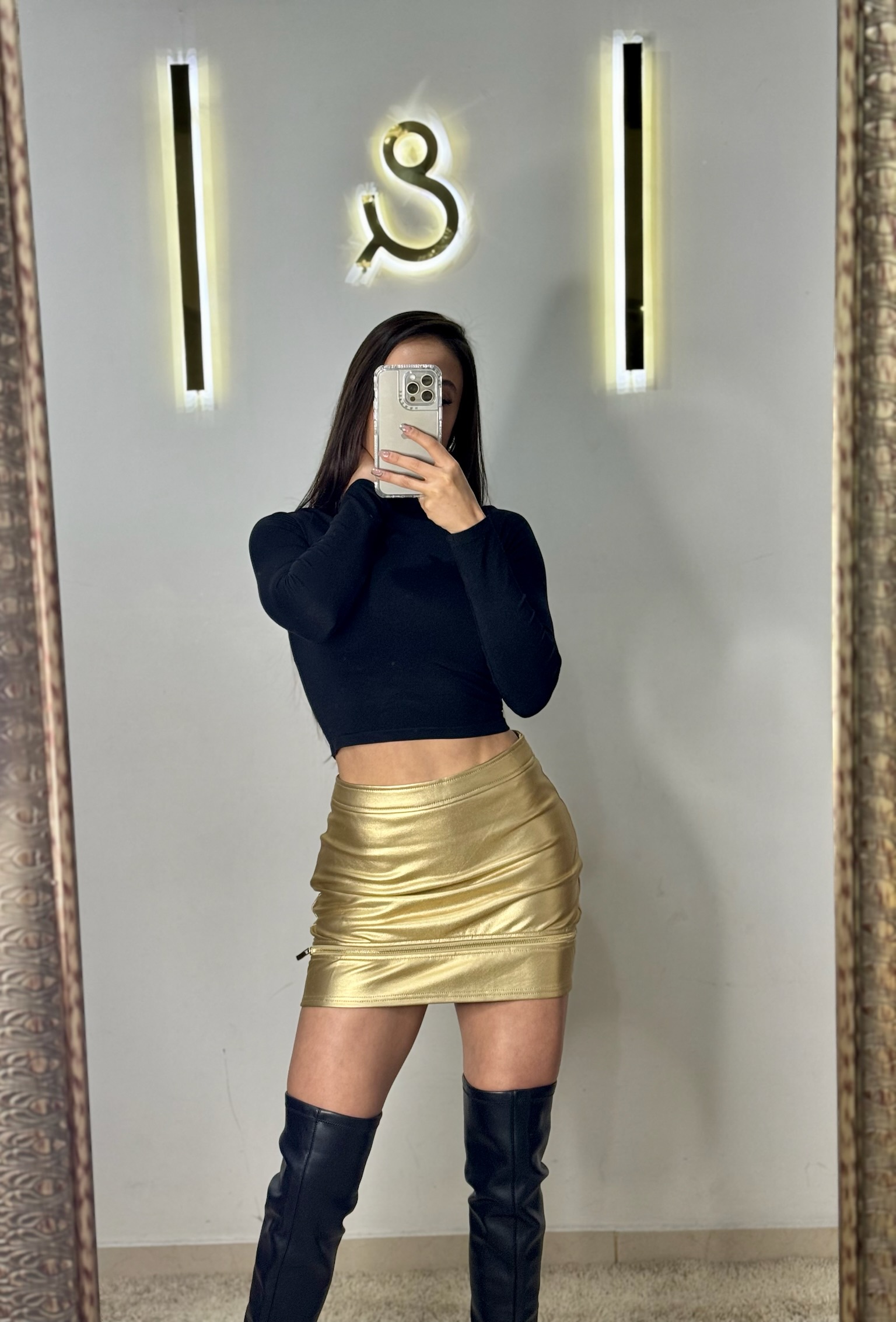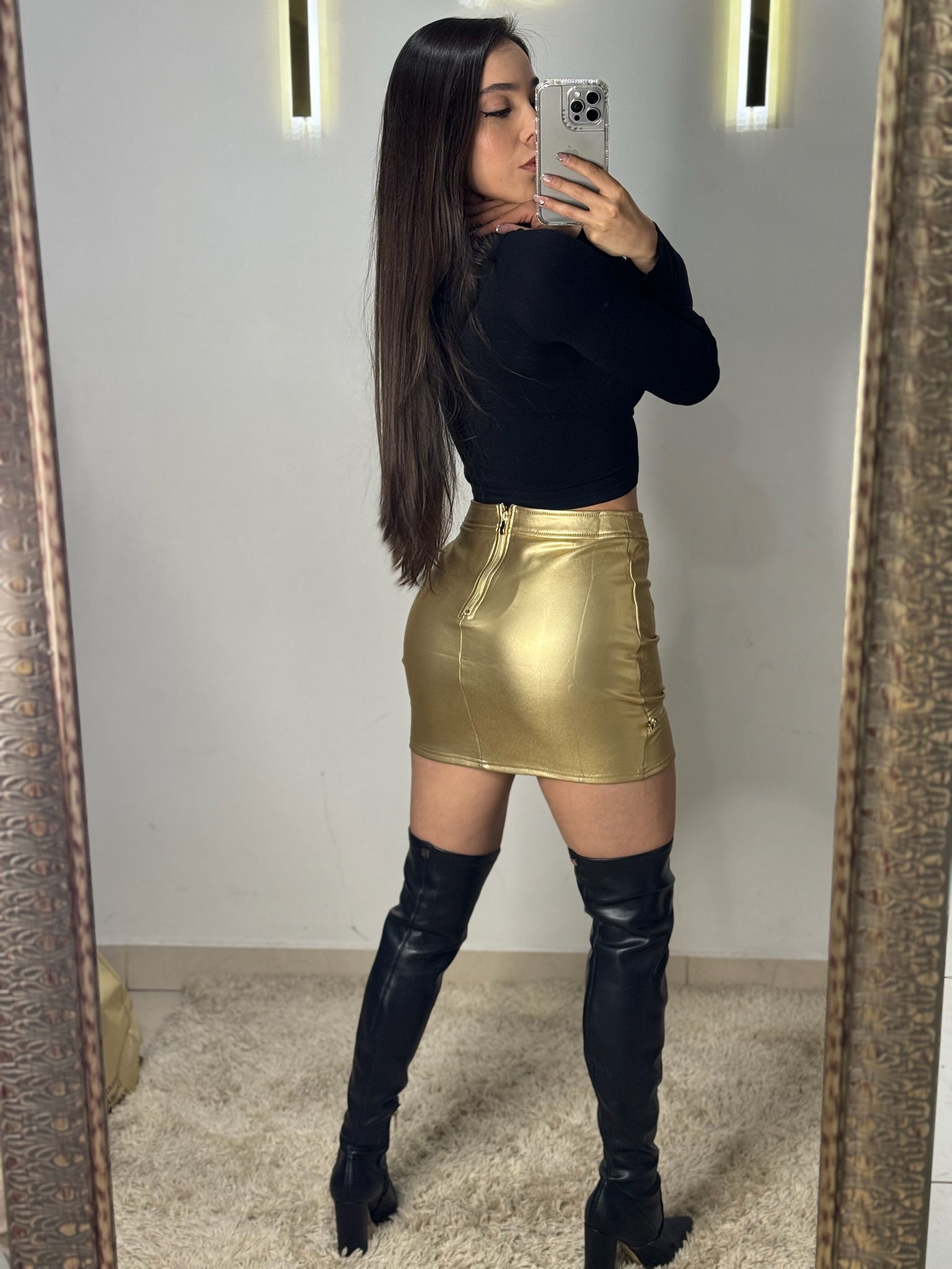 Falda de vinipiel con detalle de cierre de forma horizontal. En colores negro y dorado.