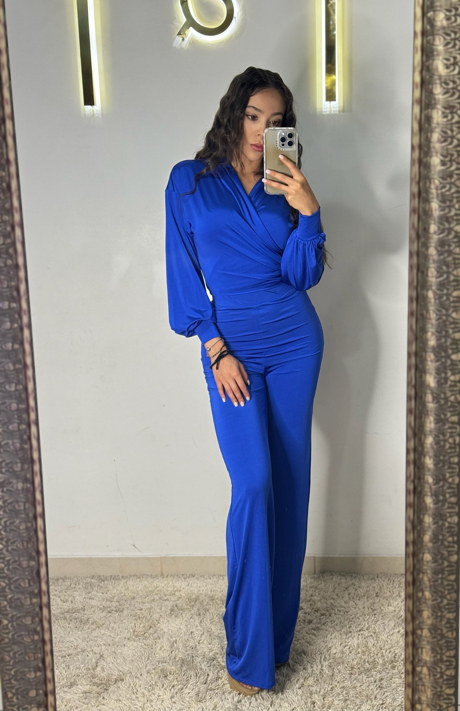 Set de dos piezas de licra color azul rey, acampanado y manga larga.