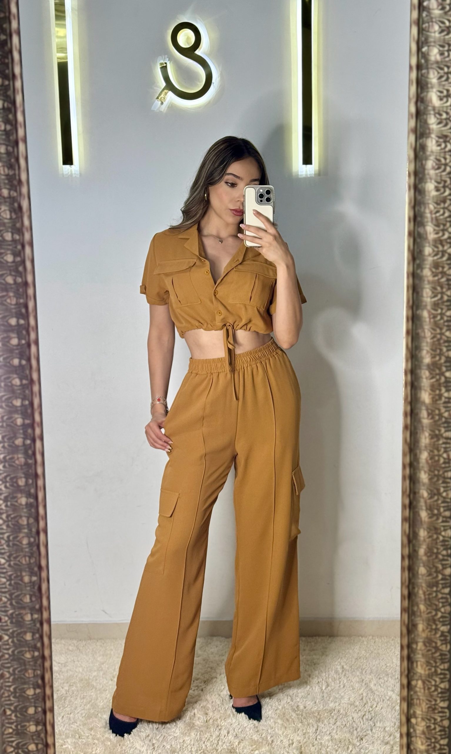 Pantalón tipo cargo con resorte. Blusa con bolsas y ajuste en la cintura.