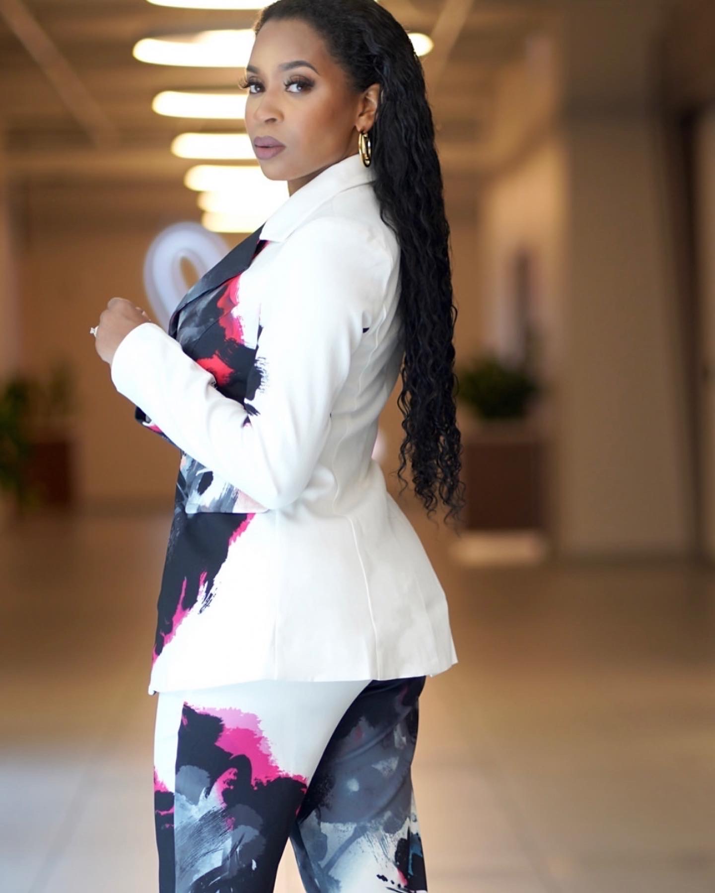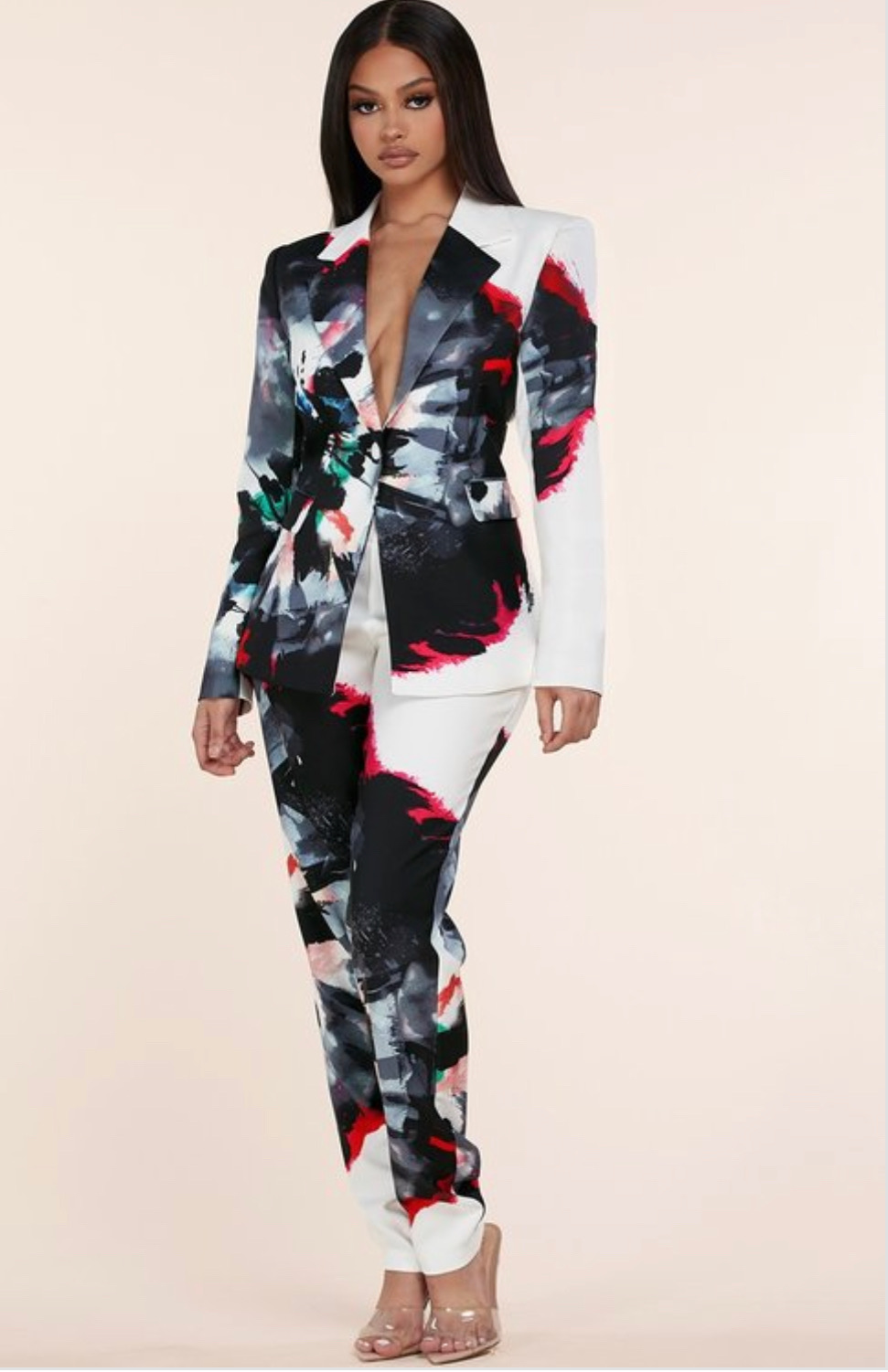 Set de vestir de dos piezas color blanco con estampado en diferentes tonalidades.